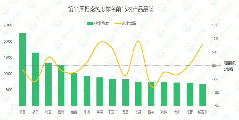 惠農(nóng)網(wǎng):第11周排名前15農(nóng)產(chǎn)品品類市場關(guān)注度漲跌互現(xiàn)